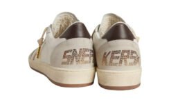 Sognando gli anni Ottanta. Le nostre sneaker Ball Star si rifanno all’atmosfera dei college americani, tra un tiro a canestro e un giro in skateboard. Come questo modello, realizzato in nappa bianca si caratterizza per la stella dorata e il talloncino nero. E come tocco finale, i lacci di colore bianco e la scritta Sneakers sul tallone in font “metal” in mini cristalli dorati.