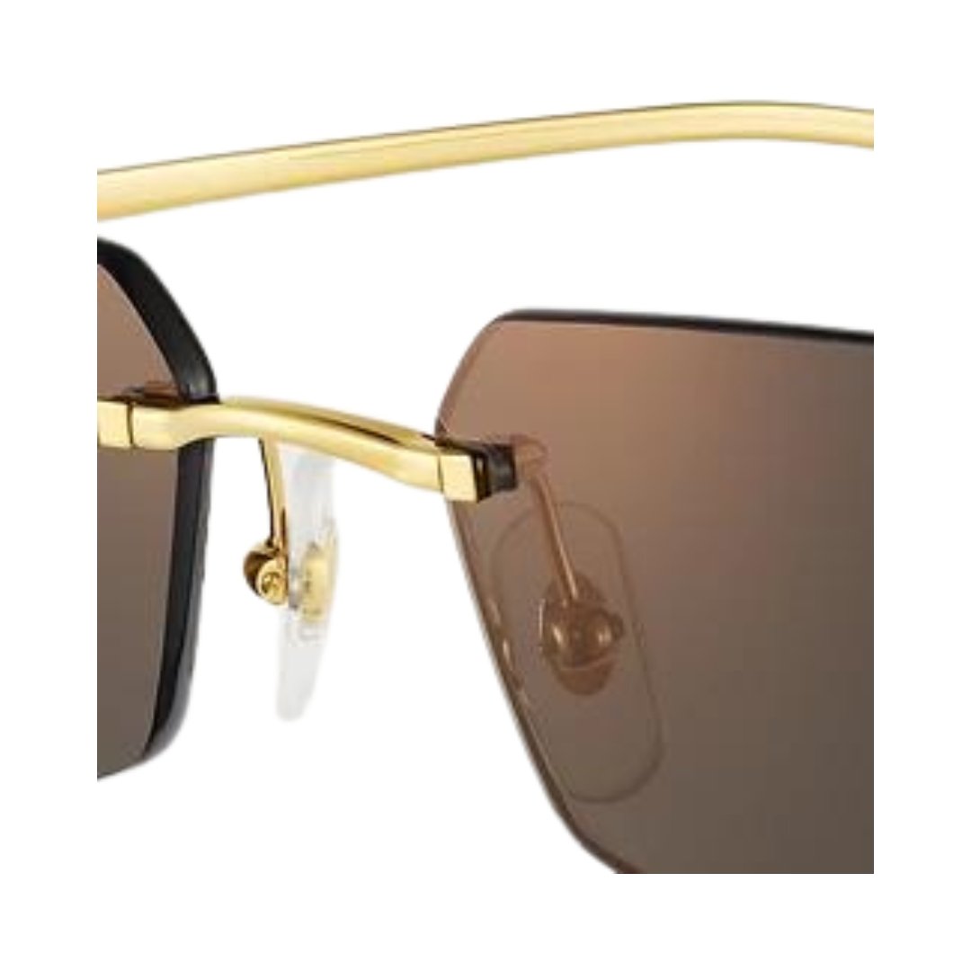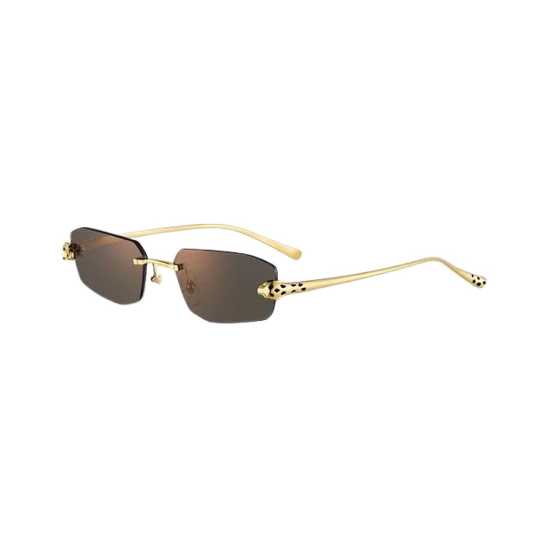 Occhiali da sole Panthère de Cartier in metallo non cerchiato, finitura oro liscia, forma rettangolare, lenti grigie effetto specchio dorato. Dimensioni delle lenti 56 mm, del ponte 18 mm, delle aste 145 mm.