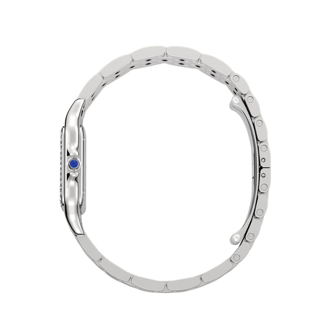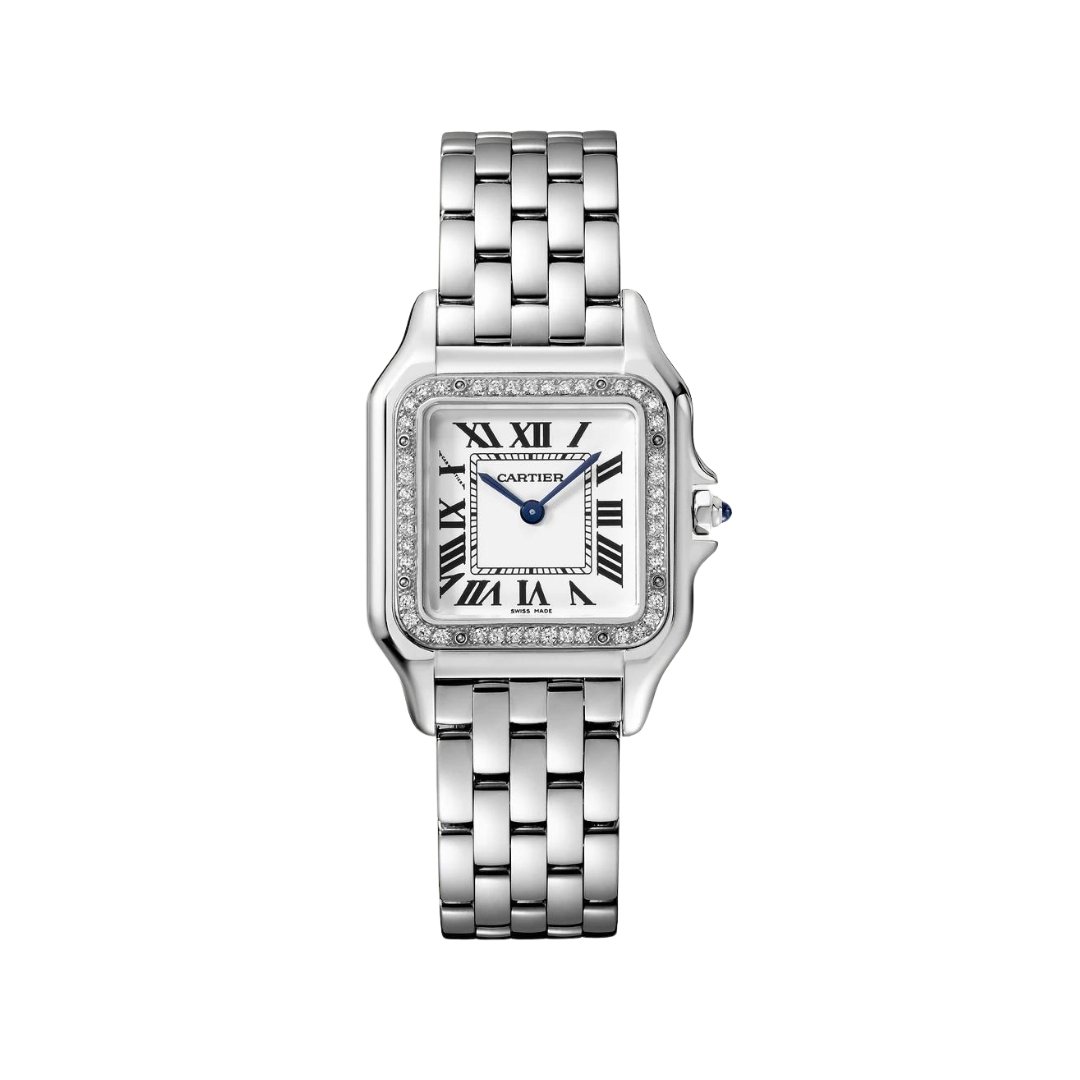 Orologio Panthère de Cartier, modello medio, movimento a quarzo. Cassa in acciaio, lunetta ornata di diamanti taglio brillante, dimensioni 29 x 37 mm, spessore 6 mm, corona ornata di uno spinello sintetico blu, quadrante argentato, lancette a forma di gladio d’acciaio azzurrato, bracciale in acciaio, impermeabile fino a 30 metri.