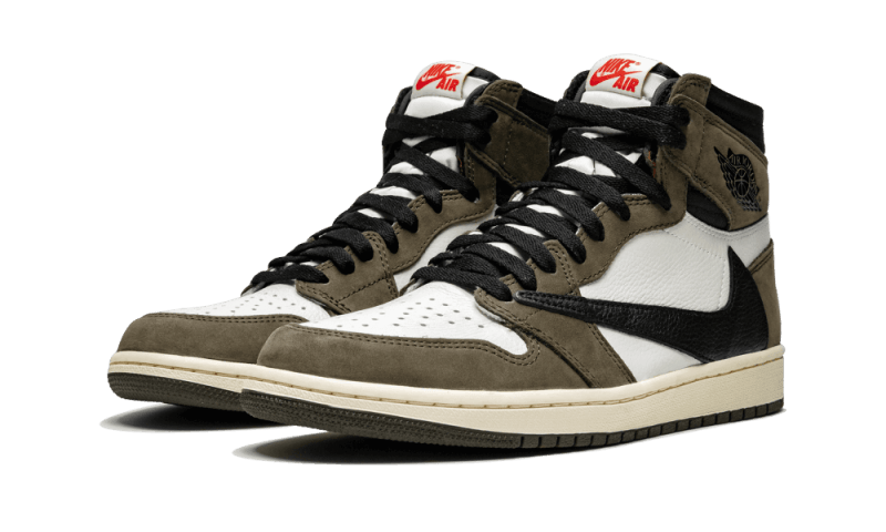 Le Air Jordan 1 Travis Scott presentano una tomaia in pelle bianca con sovrapposizioni in suede Mocha e Swoosh in pelle nera invertiti. I tocchi di rosso sulla linguetta contrastano leggermente con le tonalità terrose del design. Sul tallone, un logo Cactus Jack in rilievo aggiunge un tocco personalizzato. Da lì, una suola intermedia ingiallita e una suola esterna Mocha completano il design.